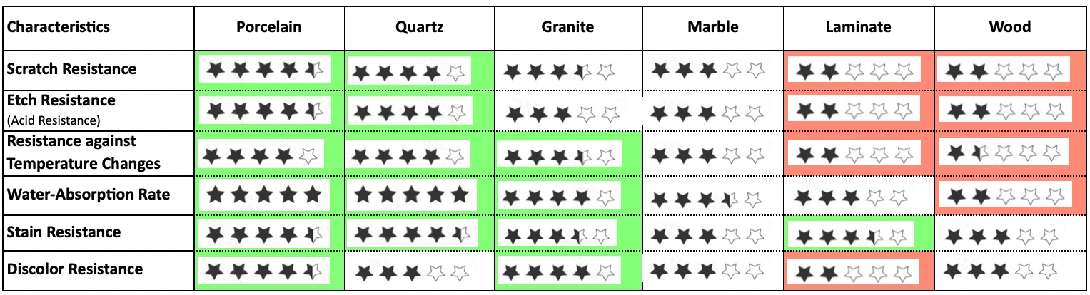 In the following, we will review these characteristics among different materials, including laminate, wood, marble, granite, quartz, and porcelain.