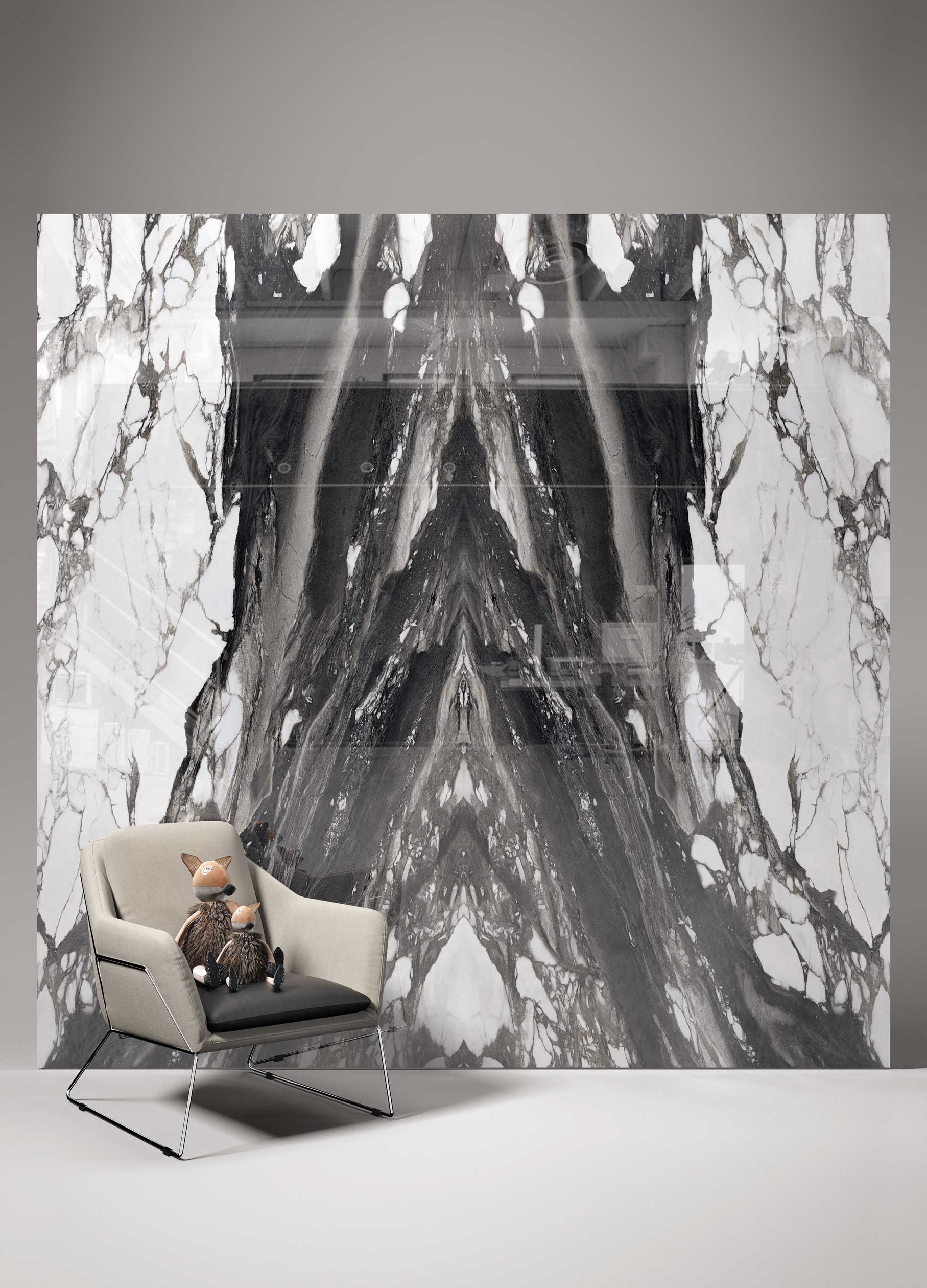 A premium calacatta porcelain slab with a 3D sense of splashed ink on white screen. Perfect for floor & wall, bathroom, and kitchen countertop and island.