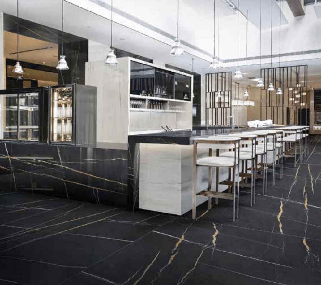 Functional Benefits: Beyond its striking appearance, the Sahara Noir Porcelain Slab offers practical advantages. Its surface is highly resistant to stains and scratches, making it an ideal choice for busy environments. Additionally, its non-porous nature ensures a hygienic surface, easy to clean and maintain, particularly important for kitchen and bathroom applications.